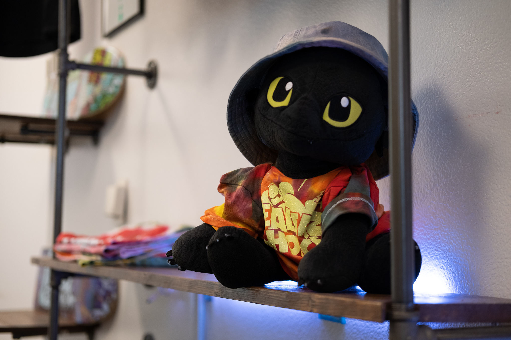Colorful clouds hang from the ceiling inside the Dealerz Choice store tucked away behind the Plaza Perks Cafe on the main floor of the Courthouse Plaza. The cloud colors cycle through blues, purples, and greens.