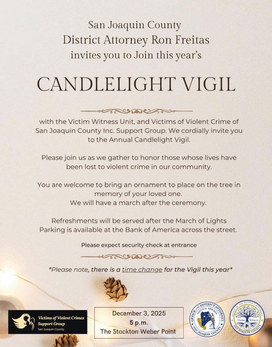San Joaquin County District Attorney Ron Freitas cordially invites you to the Candlelight vigil with the Victim Witness Unit, and Victims of Violent Crime of San Joaquin County Inc. Support Group.