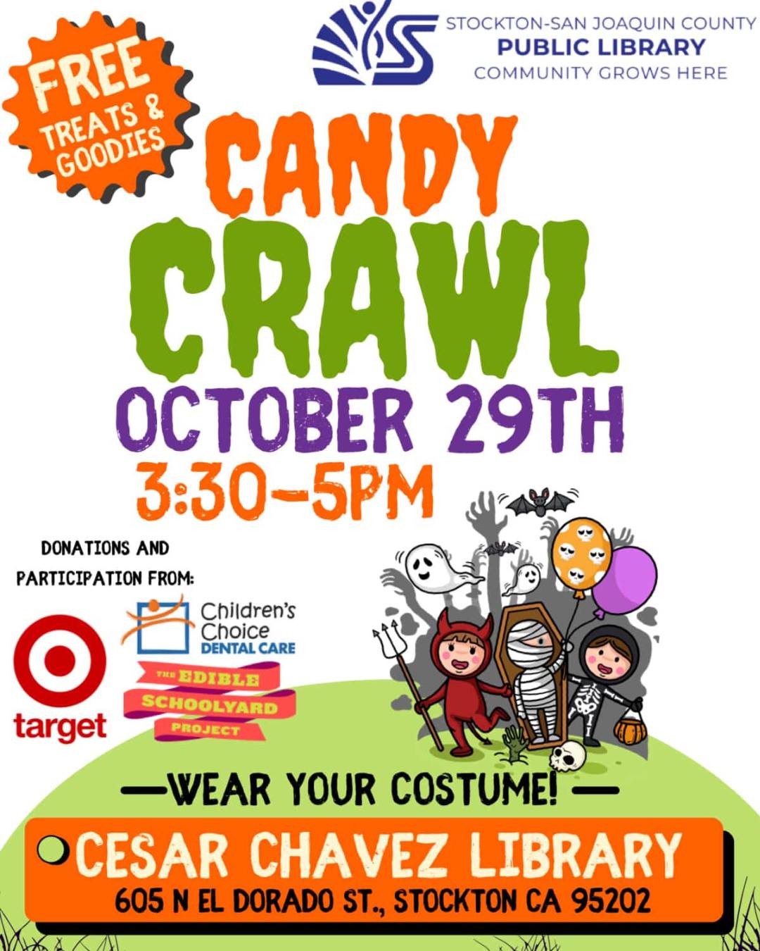 Candy Crawl Categorized Under: Family , Free Date Oct 29 2025 Time 3:30 pm - 5:00 pm FREE Halloween Event for the kiddos! Visit the Cesar Chavez Library with your kids in their best costumes for some free treats! Location Cesar Chavez Central Library 605 N El Dorado St, Stockton, CA 95202