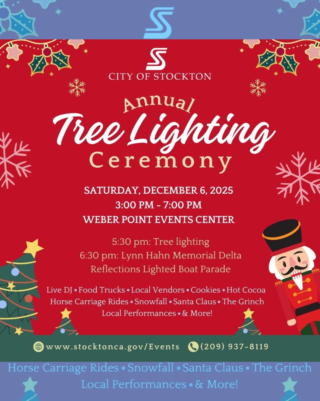 The holidays are coming and it’s time for the City of Stockton Annual Holiday Tree Lighting Ceremony, Sat., Dec. 6th, at Weber Point Events Center. Gates open at 3pm; tree lighting at 5:30pm. Enjoy Live DJ, Food Trucks, Local Vendors, Cookies, Hot Cocoa, Horse Carriage Rides, Snowfall, Santa Claus, The Grinch, Local Performances and more. Stay for the Lighted Boat Parade at 6:30pm.