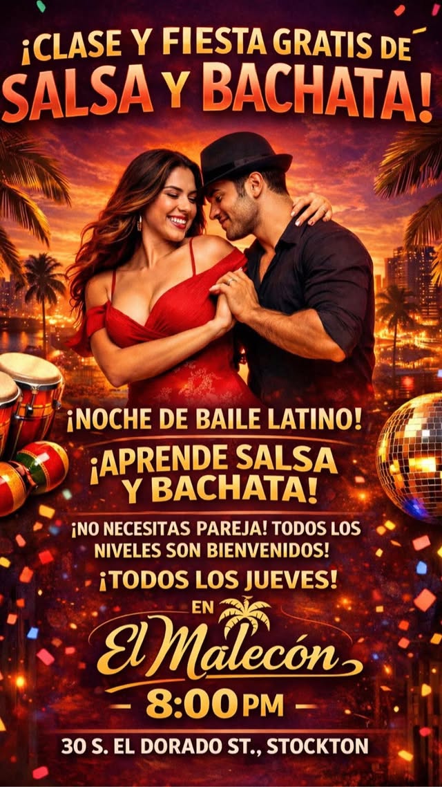 Free Salsa & Bachata Lesson Party Categorized Under: Dancing , Free , Music Date Apr 09 2026 Time 8:00 pm - 11:00 pm Latin Dance Night – Every Thursday! Learn Salsa and Bachata. No partner needed. Website Location Malecon Antro Bar 30 S. El Dorado St. Stockton, Ca