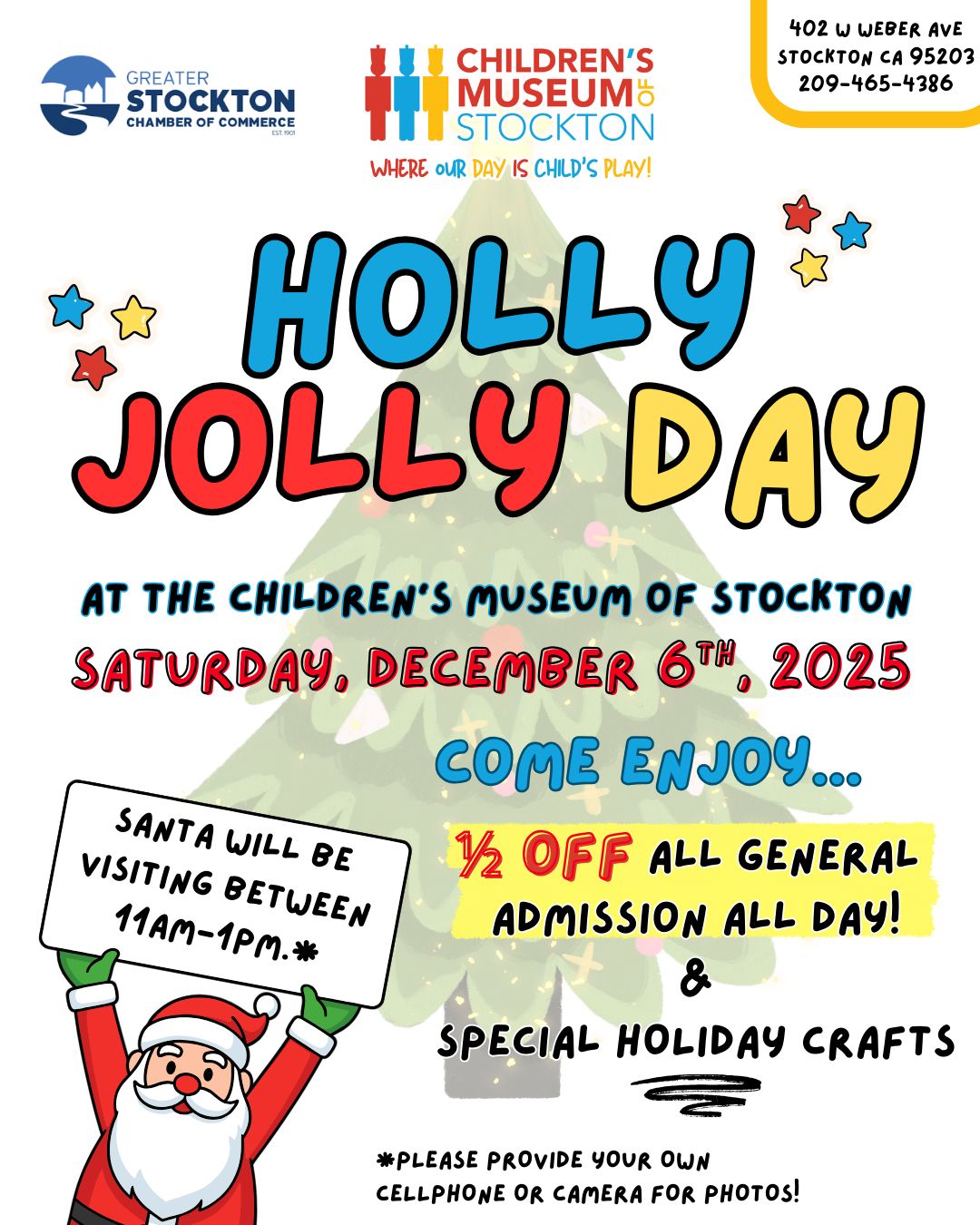 Holly Jolly Day Categorized Under: Community , Family , Holidays Date Dec 06 2025 Time 10:00 am - 5:00 pm On Holly Jolly Day (Dec 6th) admission is half off, so it’s $5.00 per person (ages 1+). See you there! Website Location Children's Museum of Stockton 402 West Weber Avenue Stockton CA US