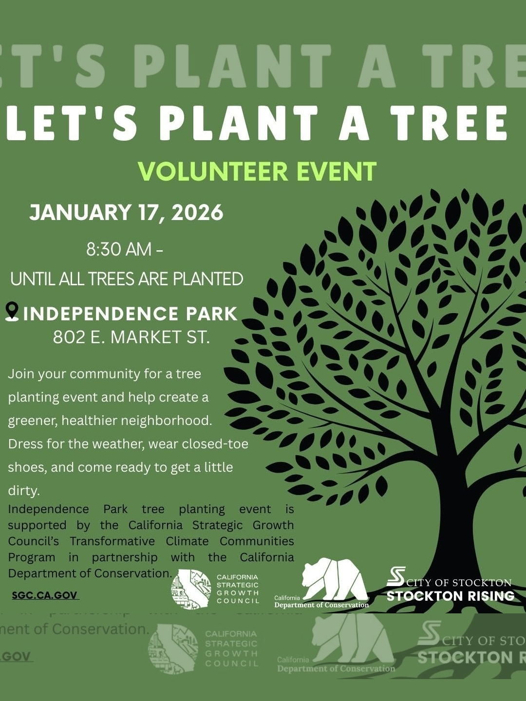 Let’s Plant a Tree Categorized Under: Community , Free Date Jan 17 2026 Time 8:30 am - 12:00 pm Volunteer Event – Join your community for a tree planting event and help create a greener, healthier neighborhood. Dress for the weather, wear closed-toe shoes, and come ready to get a little dirty. Location Independence Park 802 E. Market St. Stockton, CA