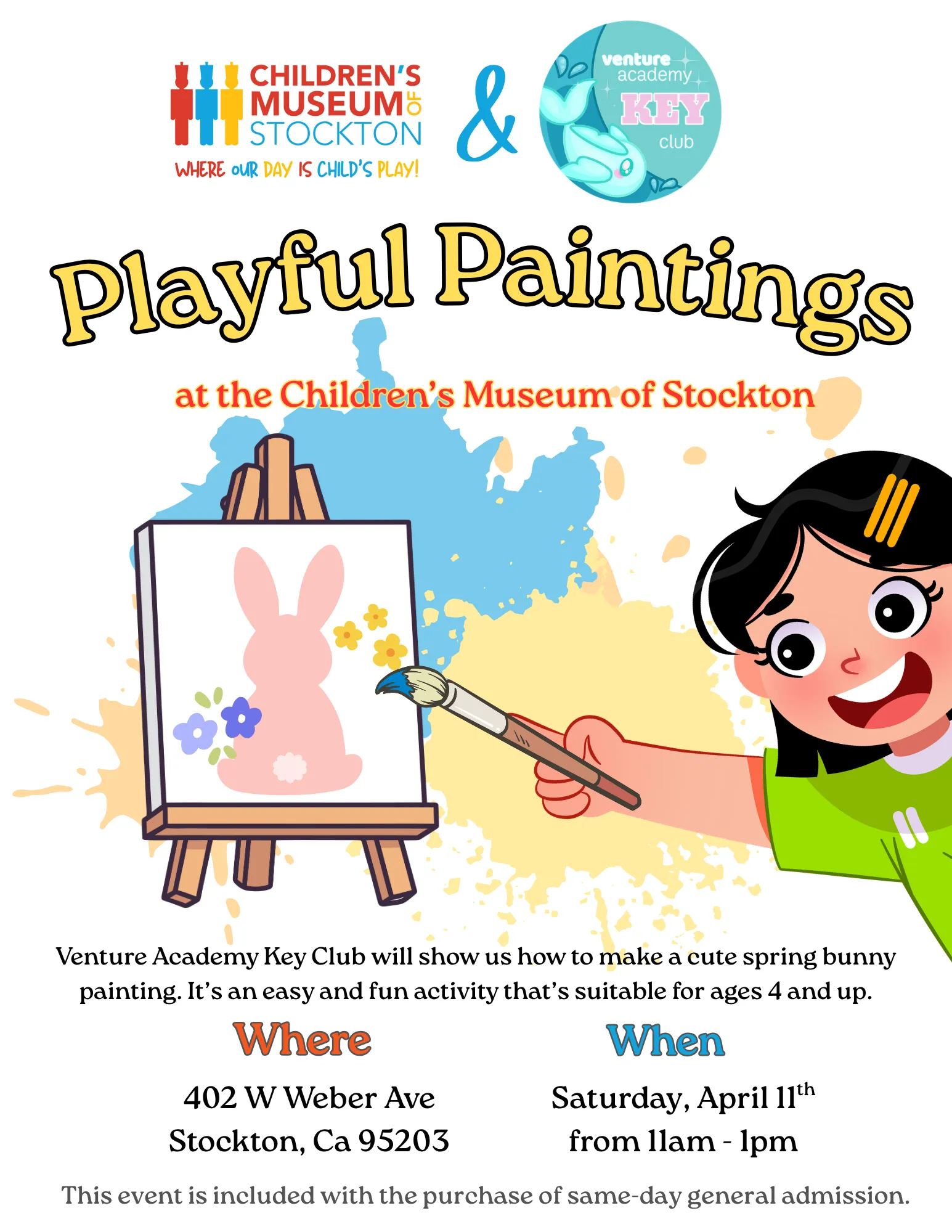 Playful Paintings Categorized Under: Arts , Community , Family Date Apr 11 2026 Time 11:00 am - 1:00 pm Event included with same-day general admission of $10 per person. Children under 1 year of age are free. Website Location Children's Museum of Stockton 402 West Weber Avenue Stockton CA US
