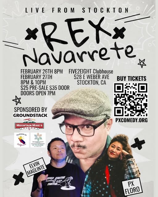 Rex Navarrete Live Categorized Under: Performance Date Feb 27 2026 Time 8:00 pm - 10:00 pm Join Rex Navarrete with Elvin Maglinte and PX Floro for two nights of hilarious Filipino standup comedy! $25 Presale, $35At The Door https://pxcomedy.org/ Link in their bio too! Location Five2Eight Clubhouse 528 E. Weber Ave. Stockton, CA