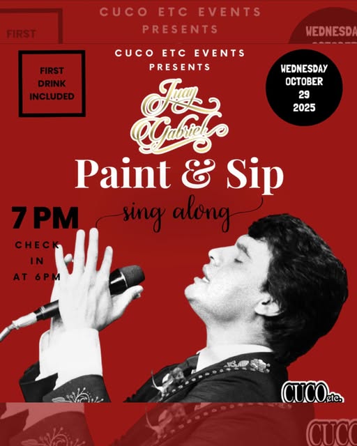 The Juan Gabriel Paint & Sip Night Categorized Under: Arts , Community , Music Date Oct 29 2025 Time 7:00 pm - 9:00 pm Stockton – The Juan Gabriel Paint & Sip Night is October 29th! Call your friends and enjoy the night at Downtown here! Purchase tickets below or in bio! https://www.cucoetc.com/paint-and-sip-events Location Lavaca Nightclub 445 W. Weber Ave. Stockton, CA 95203