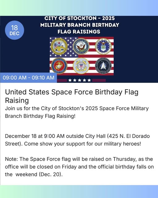 Join them for the City of Stockton’s 2025 Space Force Military Branch Birthday Flag Raising!