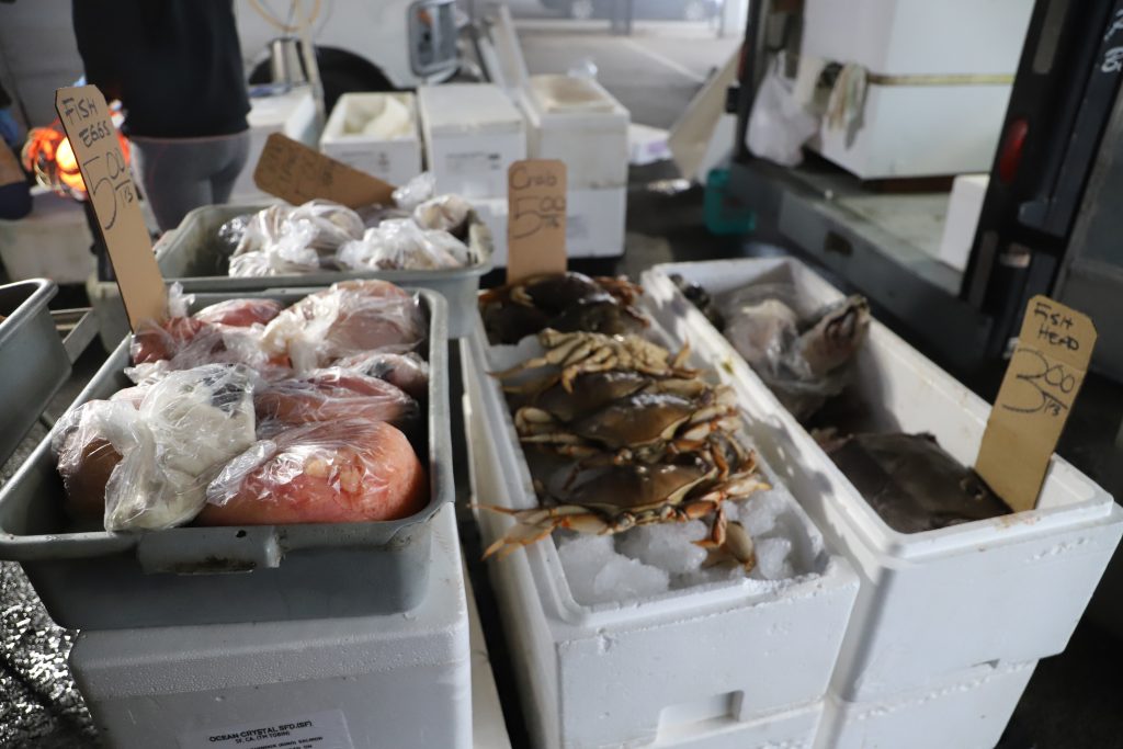Fish egg, crab, and fish head by the pound.