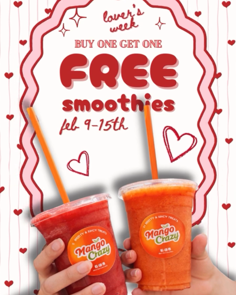 - Mango Crazy is bringing back a Buy One Get One Free special for their fresh, fruity smoothies. This week from February 9th to February 15th , come with a friend, family member, or lover for a second smoothie on the house.