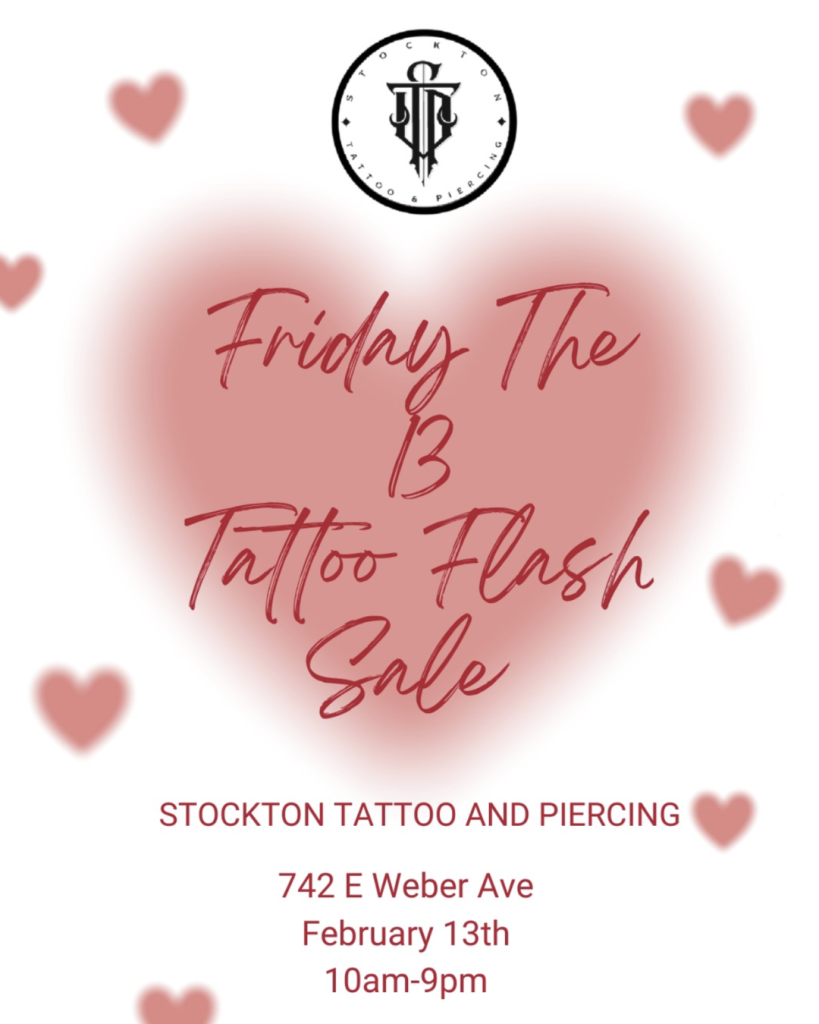 - Stockton Tattoo and Piercing is having a flash tattoo sale for Friday the 13th. Come in as early as 10AM and as late as 9PM for your pre-designed Valentine’s Day themed tattoo!