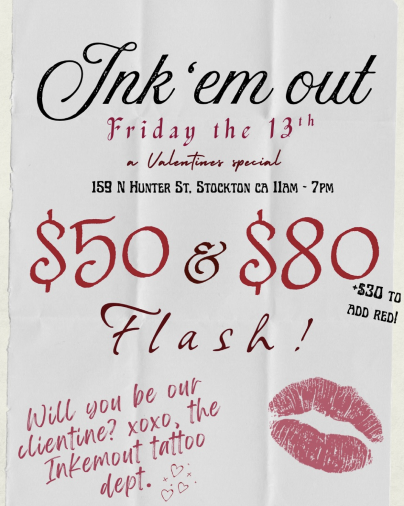 - Ink’em Out is hosting a Friday the 13th Valentine’s Special with love inspired flash tattoos. Choose between black and red ink and a wide variety of designs as their client-ine!